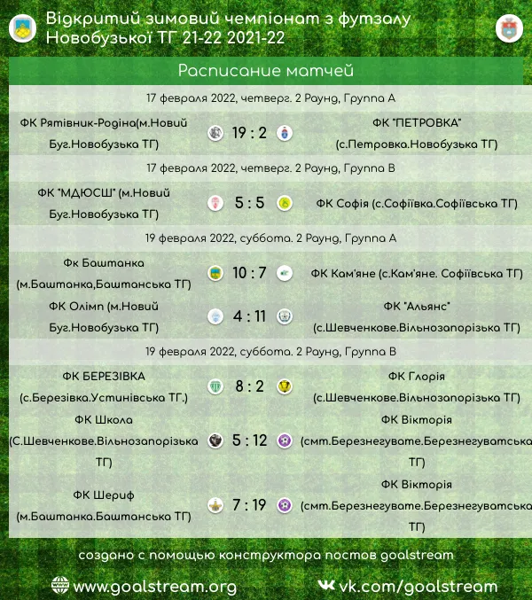 У суботу, 19 лютого, відбувся другий тур другого кола Відкритого зимового чемпіонату Новобузької ТГ з футзалу 2021-2022, який, нагадаємо, відбувається за підтримки міського голови М.О. Лагодієнка, Асоціації футболу Миколаївської області, районної асоціації футболу та ФСК «Колос» Новобузької міської ради.